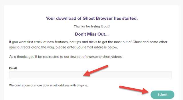 وهنا لكى تتم عملية التحميل بنجاح تقوم بكتابة اميلك الشخصى من اجل التسجيل واكمال اى خطوات وكتابة اى بيانات اخرى قد يطلبها منك الموقع ونضغط على Submit ليتم ارسال رابط تحميل المتصفح الى اميلك الذى قمت بالتسجيل به .