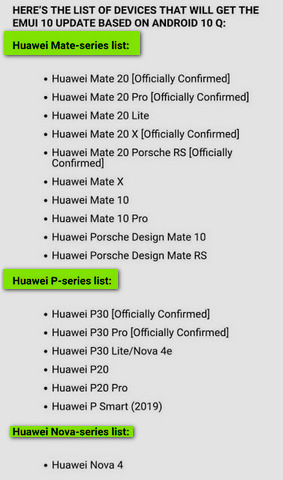 وكشفت شركة هواوي بسرعة عن أول دفعة من الهواتف الذكية التي ستتلقى تحديث اندرويد Q 10 ، وتم توسيع القائمة على جهاز هواوي Huawei Mate 20 Pro ، الذي أعلنت عنه جوجل بالفعل كواحد من الهواتف التي حصلت على الاصدار التجريبي لاندرويد Android Q beta 3 ، وتتضمن أيضًا هاتفين ذكيين من علامة هونر Honor التابعة لهواوي ، وبالنظر إلى أن الإصدار الثابت من اندرويد Q لم يصدر بعد من قِبل جوجل ، فمن غير الواضح متى تخطط هواوي بالضبط لتطبيق تحديث اندرويد Android Q الرسمي لهذه المجموعة الأولى من الهواتف.